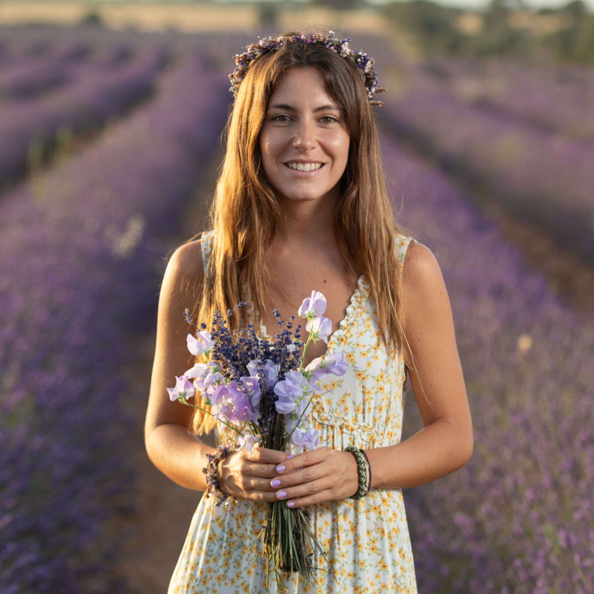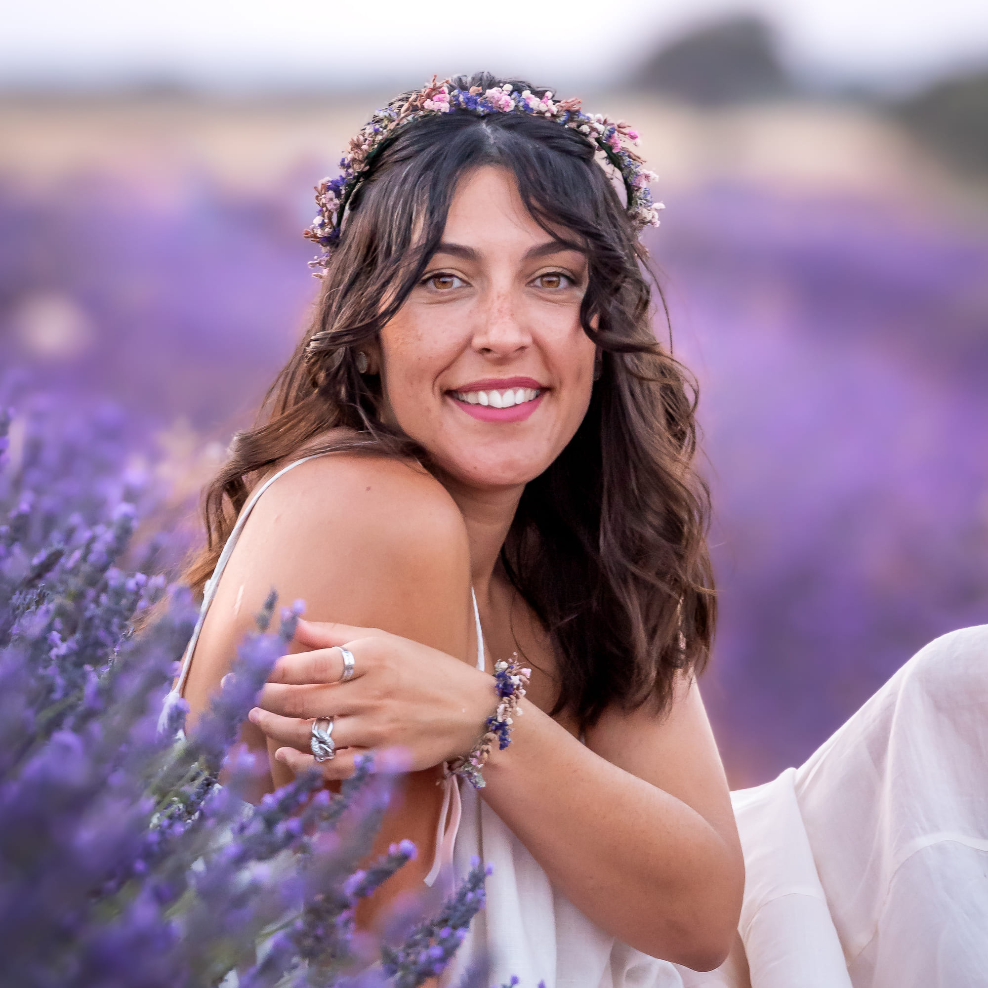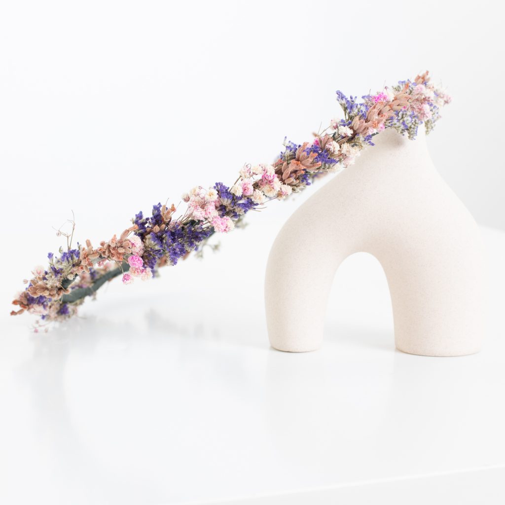 La corona Provenza, con delicadas y preciosas flores de lavanda, combina muy bien con cualquier estilo y es muy romántica.