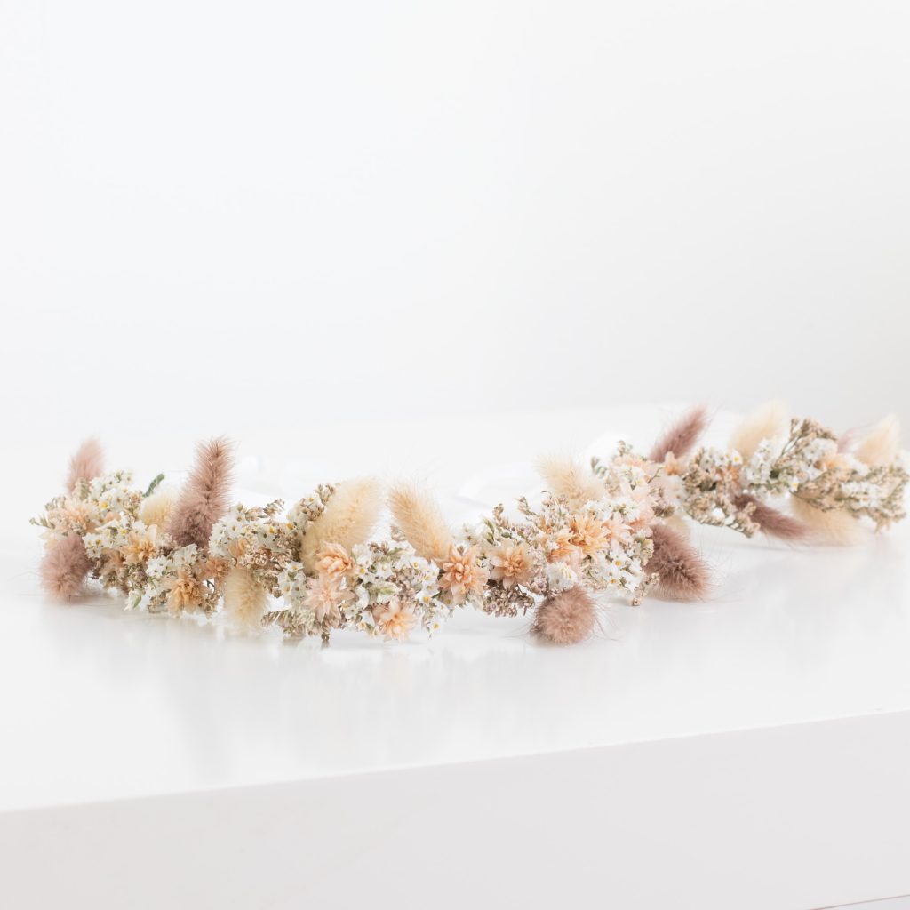 La diadema Toscana, en tonos nude, combina muy bien con cualquier estilo. La parte frontal tiene una forma apuntada para asemejarse a una auténtica corona, aportando un aire muy sofisticado.