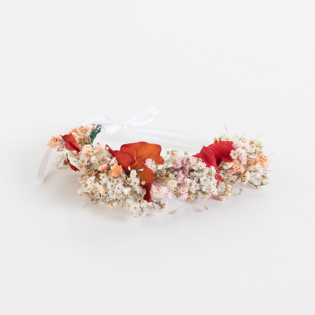 La pulsera Córdoba, con delicados pétalos de hortensia roja preservada, combina muy bien con cualquier estilo y es muy romántica y colorida.