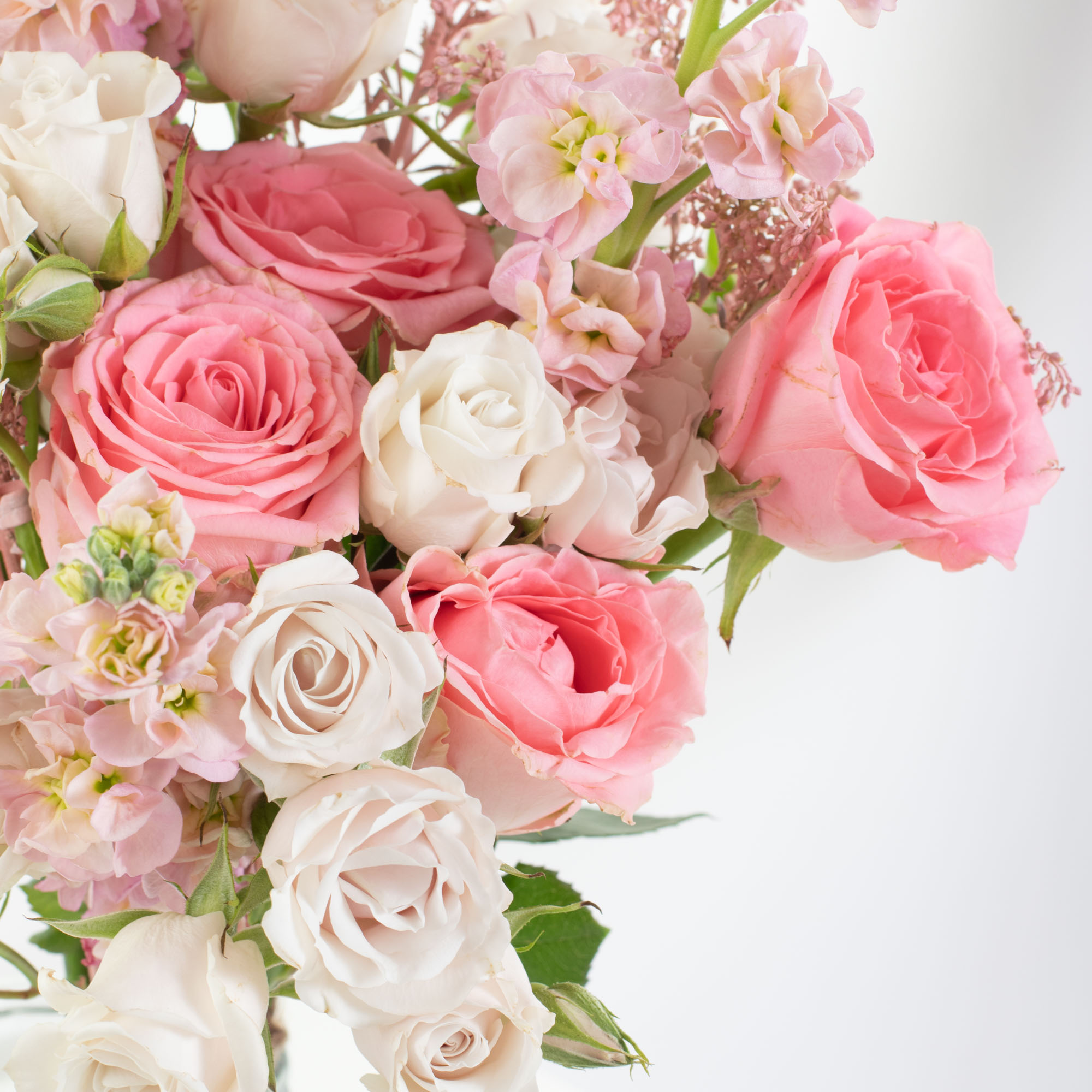 En función de las flores de cada temporada, combinaremos rosas y rosas spray con alhelíes. Seleccionamos las variedades disponibles en el momento de recibir tu pedido, para que lleguen frescas a tu casa y te duren mucho más. El diseño final puede variar ligeramente respecto de las imágenes, pero siempre utilizaremos esas tonalidades.